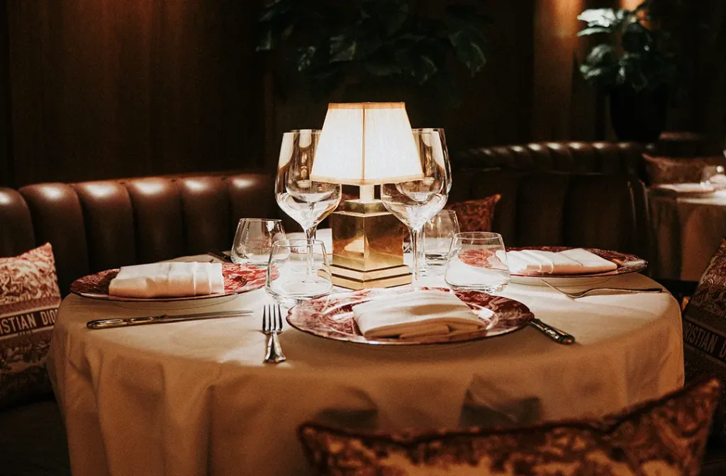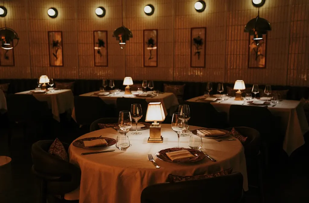 Guests are welcomed into an elevated setting where high ceilings and warm wooden floors are softened by gentle lighting and the glow of candlelight, creating a romantic and inviting atmosphere. Dark leather seating and touches of greenery add richness and depth, while the soft hum of background jazz sets a rhythm that is both refined and relaxed. Completing the scene are bold, playful artworks that lend a contemporary flair, striking the perfect balance between modern sophistication and rustic charm.